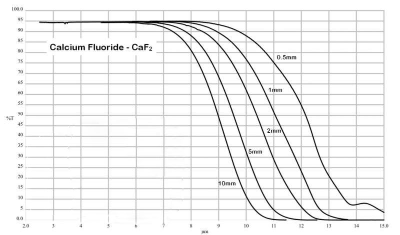 氟化钙(Calcium Fluoride, CaF2)在红外光学中有广泛应用,例如光谱用 CaF2 窗口、CaF2 棱镜和 CaF2 镜片。特别是高纯度氟化钙(CaF2)在紫外光学以及 UV 激光(Excimer 激光)窗口中具有重要应用。氟化钙(CaF2)还可以掺铕(Eu)用作伽马射线闪烁体。