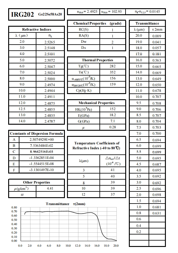 与其他红外晶体材料(如锗、硫化锌、硅、硒化锌等)相比,硫族玻璃具有以下优势: 1. 低折射率热系数,适合制作热不敏感的无温差透镜(athermalized lenses)和校正色差。 2. 易加工性,硫族玻璃软化点低,机械硬度低,比常规晶体材料更易加工成各种光学元件。 3. 低制备成本,制造硫族玻璃消耗的锗量少,其原料成本约为锗晶体的1/4。