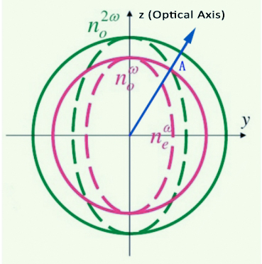 相位匹配利用晶体的双折射特性实现。如图1所示,实心圆代表o光,虚线椭圆代表e光。o光在各方向传播速度相同,而e光传播速度随方向变化。此外,不同频率光在材料中的传播速度也不同(色散现象)。