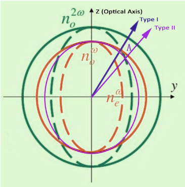 如图2所示,通过选择适当方向,使o光与e光满足相位匹配条件。II类匹配的本质是一个o光和一个e光共同转化为倍频光。